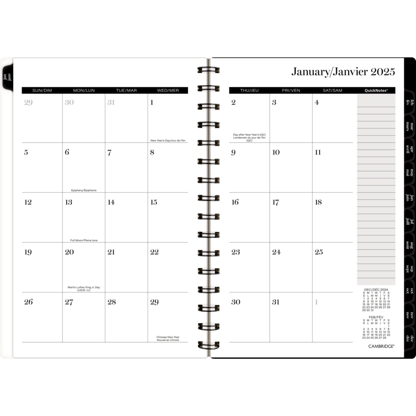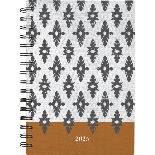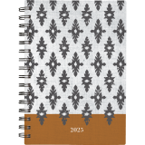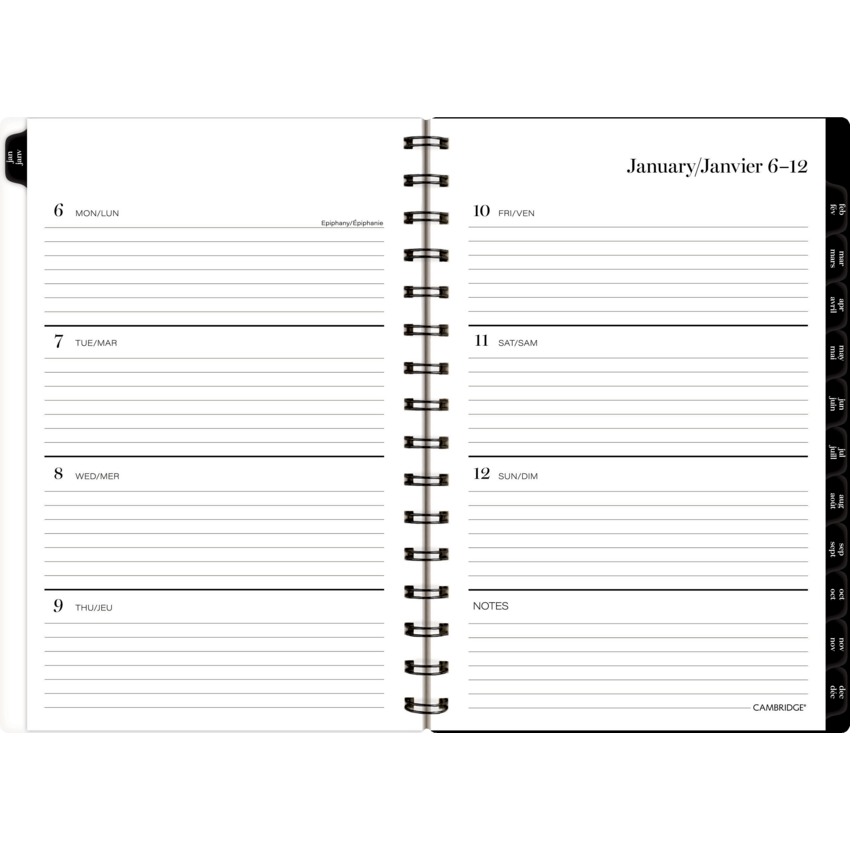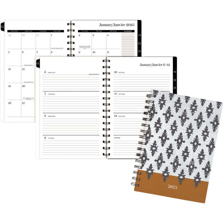 Twin Bronze coil bound. Printed poly cover. 1 week per 2-page spread. 1 month per 2-page spread. 12 months tabbed. Ink bleed resistant paper. Special pages include a double-sided poly pocket, 3-year reference calendar, holiday list, future planning pages, notetaking pages and a sticker sheet. 8-1/2" x 6". Bilingual. Black/White/Brown.