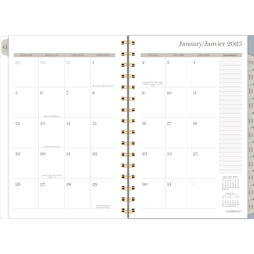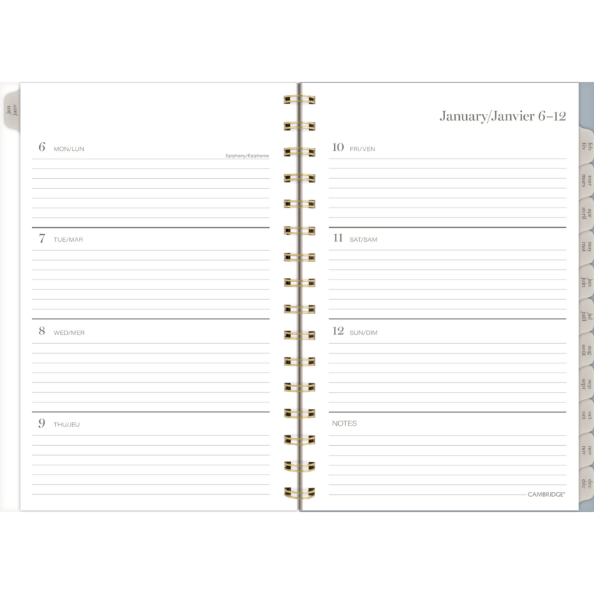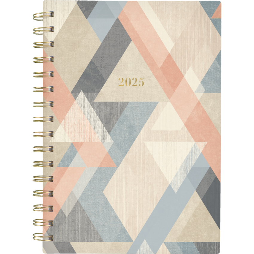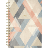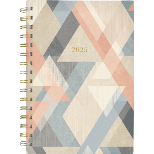 Bring strong geometric designs, solid colors and gold accents to your plans. Twin gold coil binding. Printed poly cover. Tabbed monthly pages, double-sided poly pocket, 3-year reference calendar, holiday list, future planning pages, notetaking pages and a sticker sheet. 12 month January-December. Weekly: two pages per week. Monthly: two pages per month with ruled daily section. 8-1/2" x 6". Bilingual. Multicolour.
