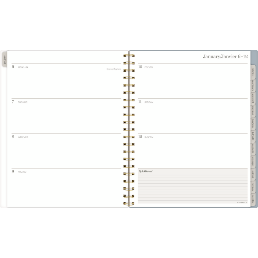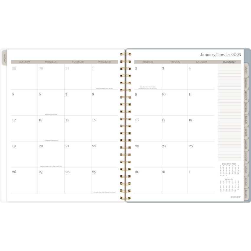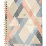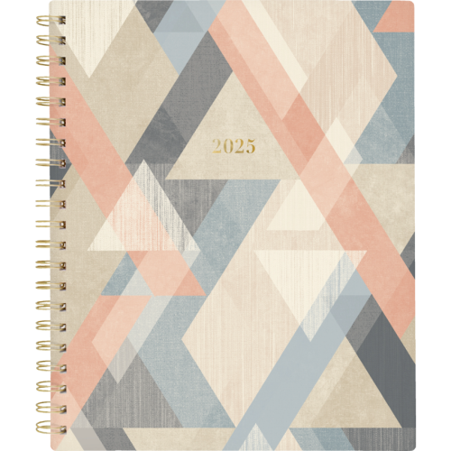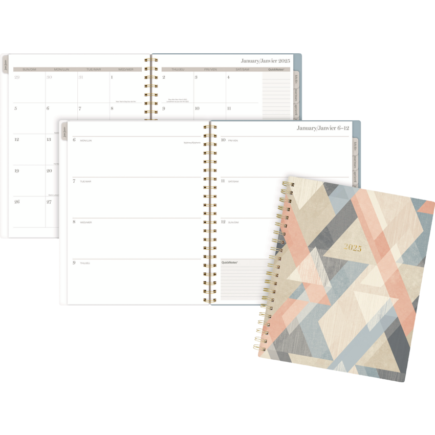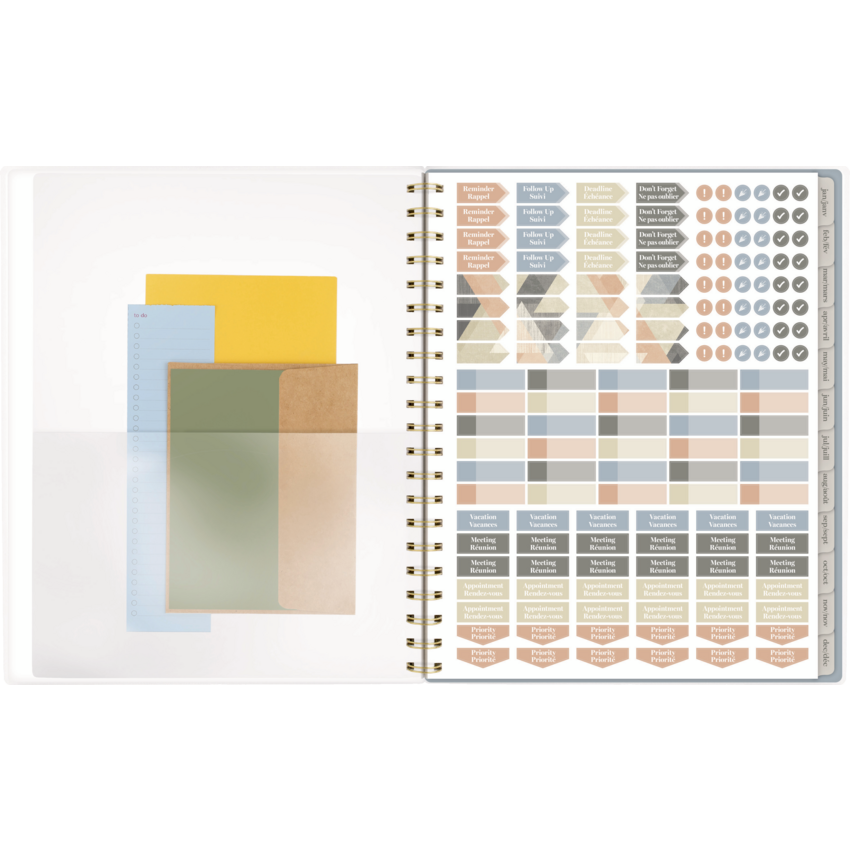 Bring strong geometric designs, solid colors and gold accents to your plans. Twin gold coil binding. Printed poly cover. Tabbed monthly pages, double-sided poly pocket, 3-year reference calendar, holiday list, future planning pages, notetaking pages and a sticker sheet. 12 month January-December. Weekly: two pages per week. Monthly: two pages per month with ruled daily section. 11" x 9". Bilingual. Multicolour.