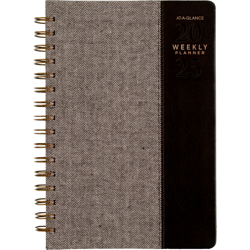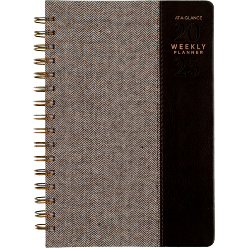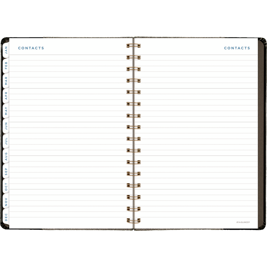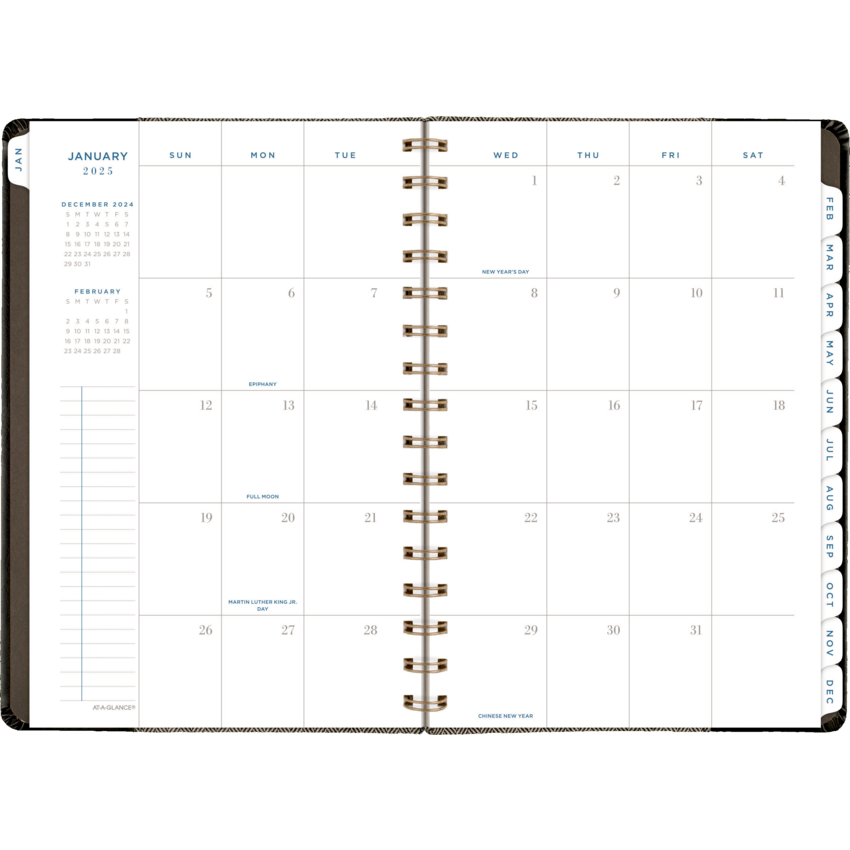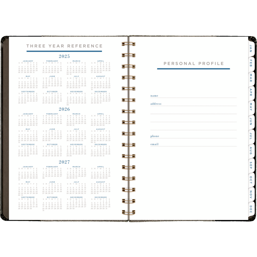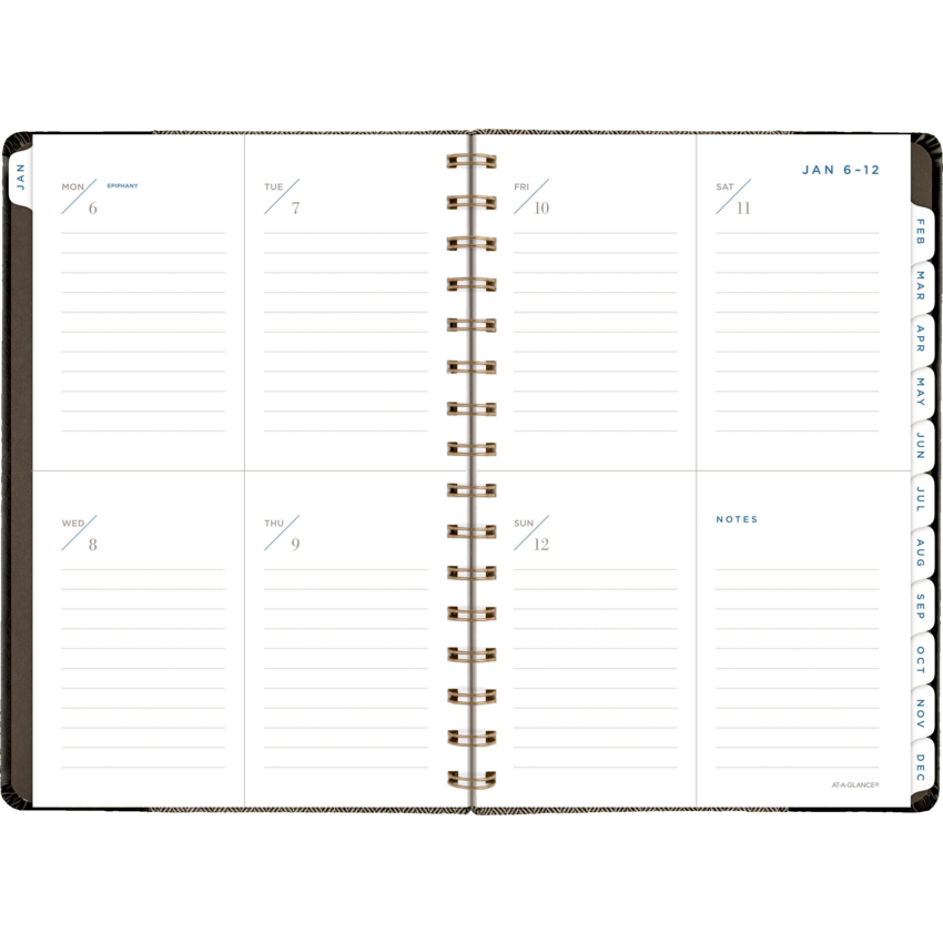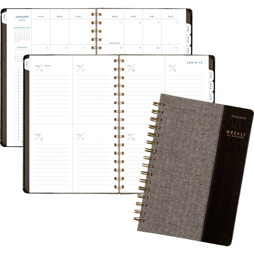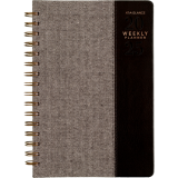 Twin coil wire bound. Flexible black cover with grey felt and bronze foil accents. 13 months January - January. 2 page per week, 2 page per month. Features ink bleed resistant paper, tabbed monthly overviews, holiday list, 3 year reference calendar, event calendar, contacts, notes and a double-sided poly pocket. 8-3/4" x 6". English. Black/Grey.