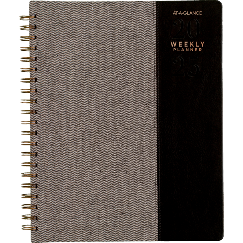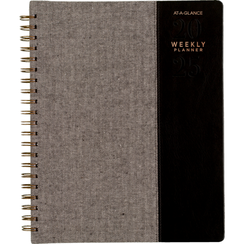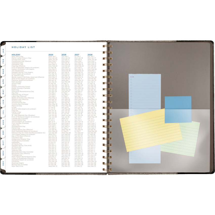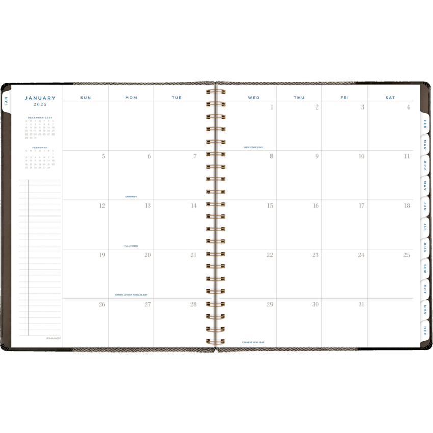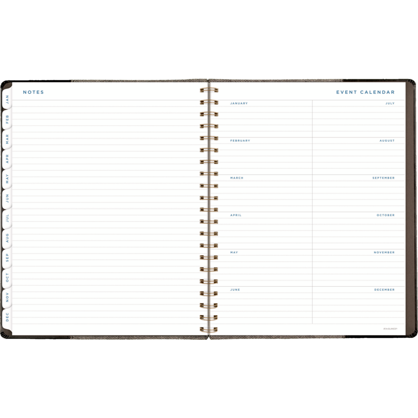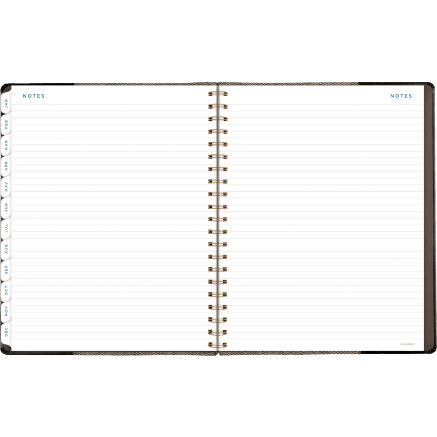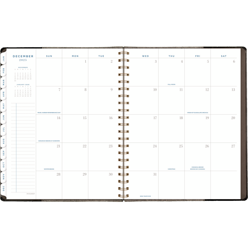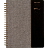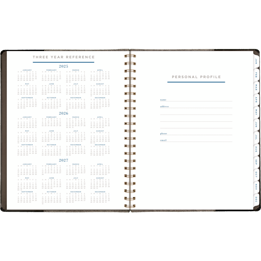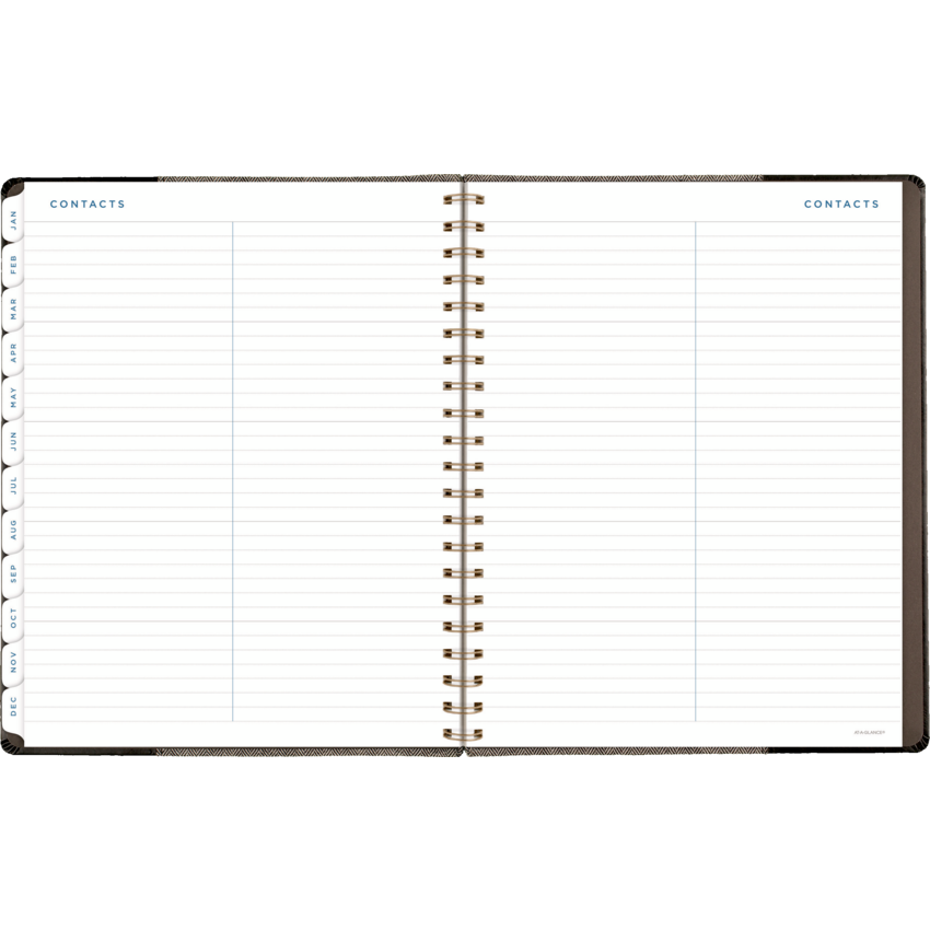 Twin coil wire bound. Flexible black cover with grey felt and bronze foil accents. 13 months January - January. 2 page per week, 2 page per month. Features ink bleed resistant paper, tabbed monthly overviews, holiday list, 3 year reference calendar, event calendar, contacts, notes and a double-sided poly pocket. 11-1/4" x 9". English. Black/Grey.