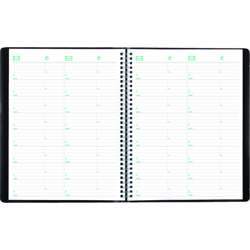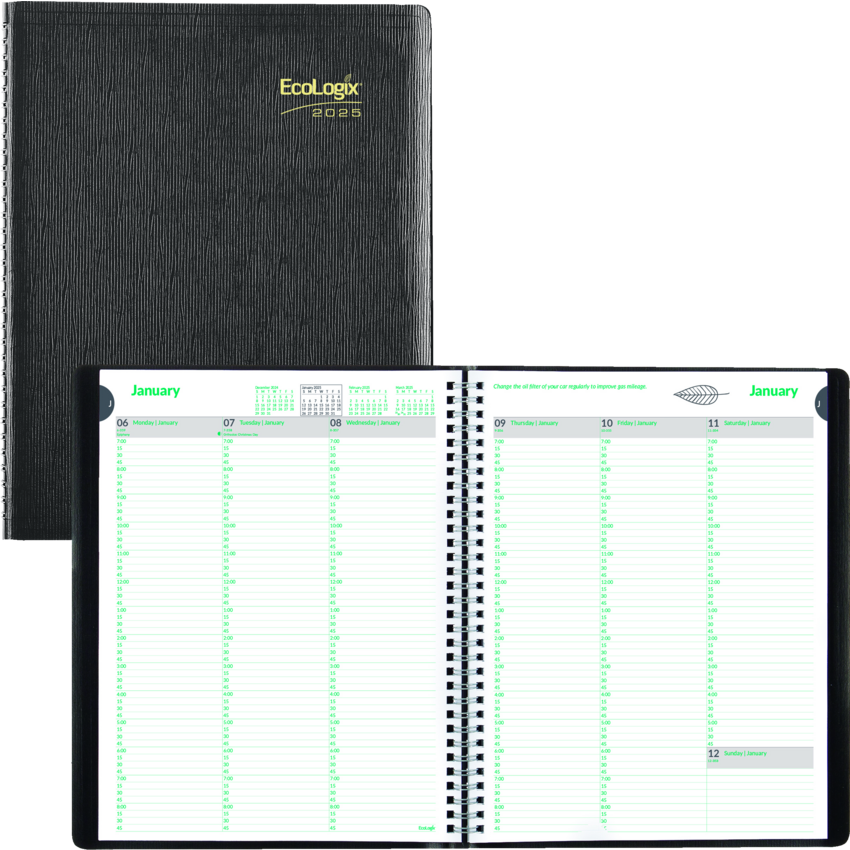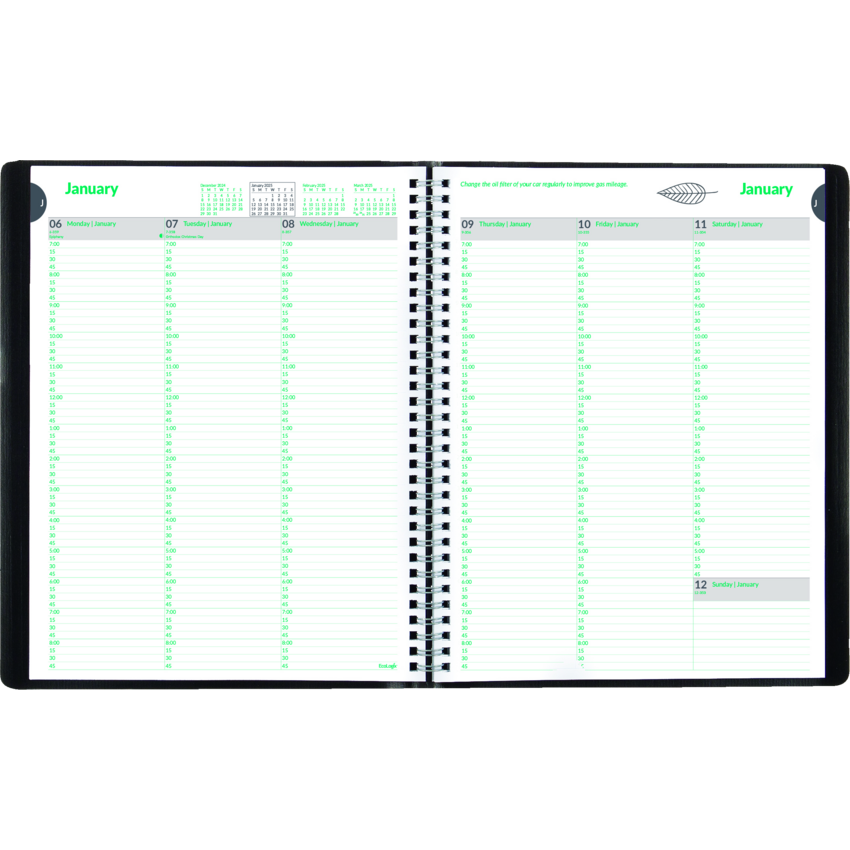 100% post-consumer recycled paper. FSC® Certified. Twin wire bound. Soft, Romanel cover. 1 week per 2-page spread. Weekdays 7:00 a.m. to 8:45 p.m. and Saturdays from 7:00 a.m. to 5:45 p.m in 15-minute intervals Ruled spaces for Sunday. Telephone and address section. Ecological tips. 11" x 8-1/2". English. Black.