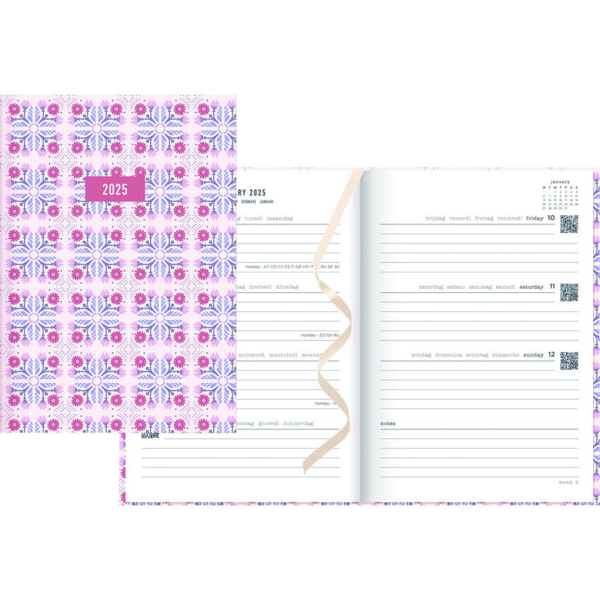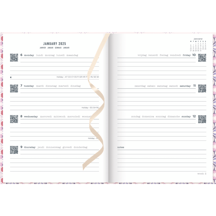 Download the free Letts® app and just plan, scan, click and go. Sewn bound. Matte laminated hard cover. Week to view planner with ruled space for each day. Monthly calendar before each month. 12 months January to December. Social diary style, ribbon page marker/bookmark, 70 gsm white paper from sustainable sources. 8-1/4" x 5-7/8". Multilingual. Pink.