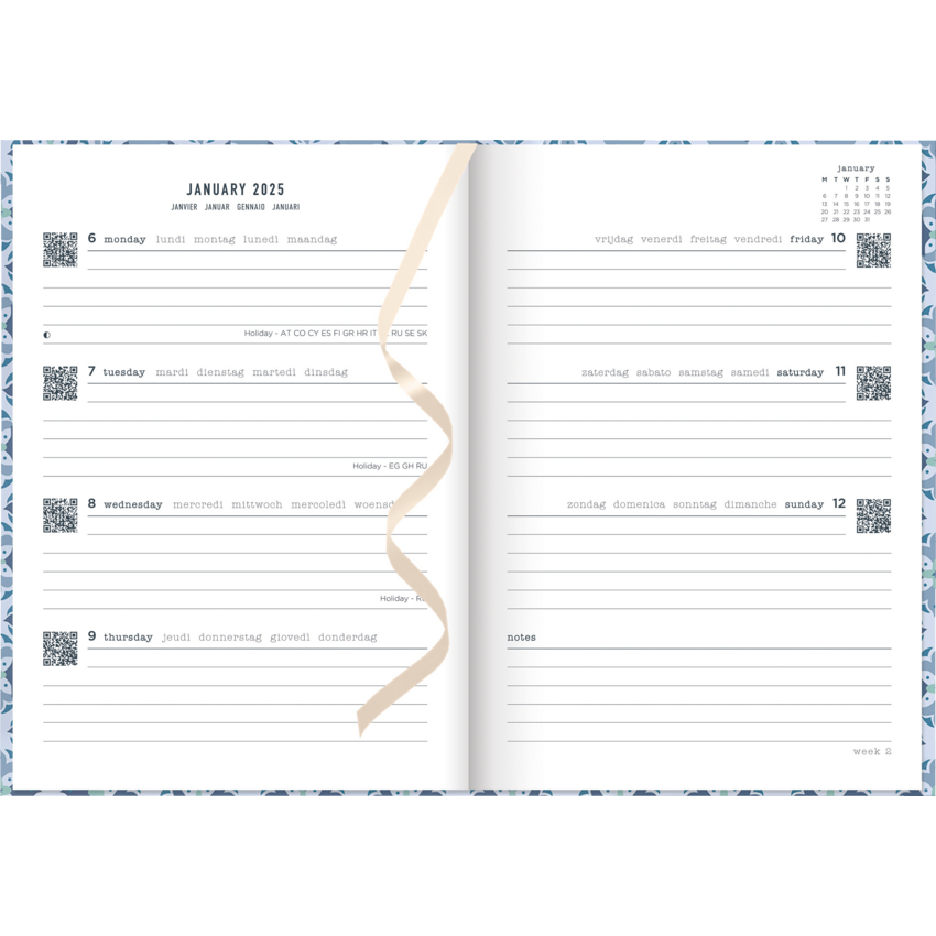 Download the free Letts® app and just plan, scan, click and go. Sewn bound. Matte laminated hard cover. Week to view planner with ruled space for each day. Monthly calendar before each month. 12 months January to December. Social diary style, ribbon page marker/bookmark, 70 gsm white paper from sustainable sources. 8-1/4" x 5-7/8". Multilingual. Blue.