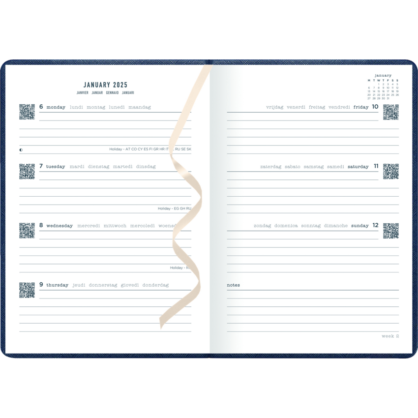 Download the free Letts® app and just plan, scan, click and go. Sewn bound. Textured, faux-leather cover. Week to view planner with ruled space for each day. Monthly calendar before each month. 12 months January to December. Social diary style, ribbon page marker/bookmark, and corner elastic closure. 8-1/4" x 5-7/8". Multilingual. Midnight.