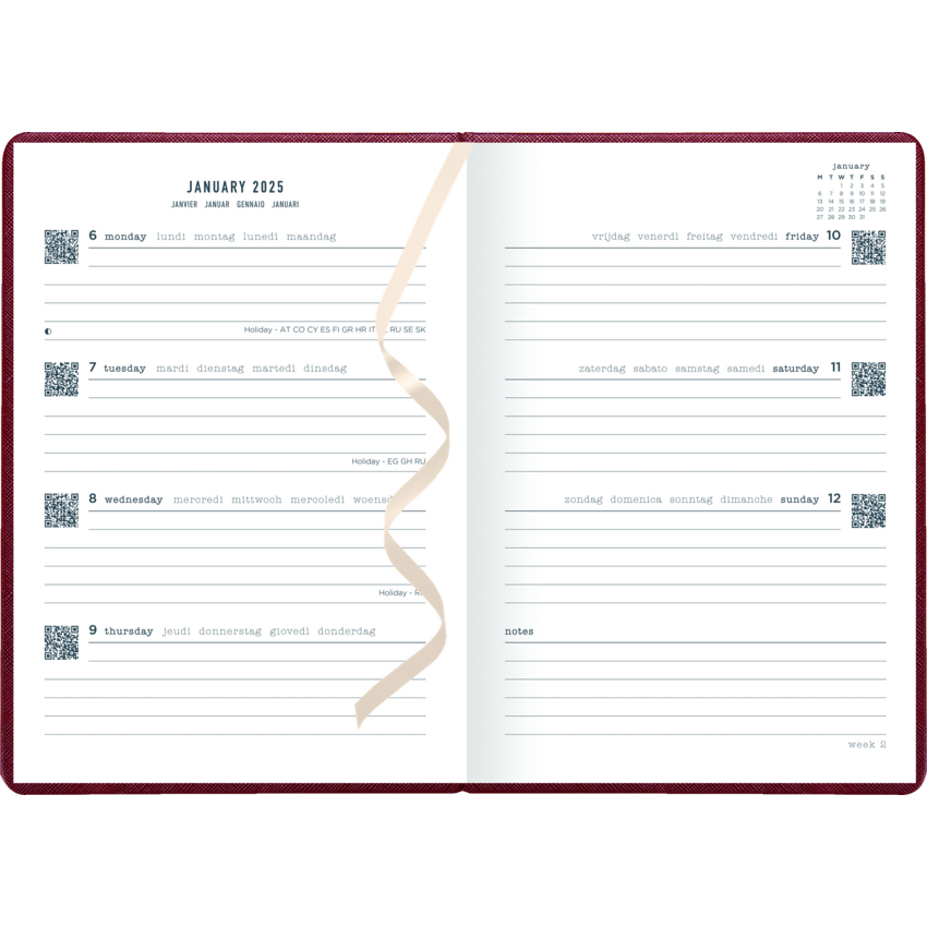 Download the free Letts® app and just plan, scan, click and go. Sewn bound. Textured, faux-leather cover. Week to view planner with ruled space for each day. Monthly calendar before each month. 12 months January to December. Social diary style, ribbon page marker/bookmark, and corner elastic closure. 8-1/4" x 5-7/8". Multilingual. Burgundy.
