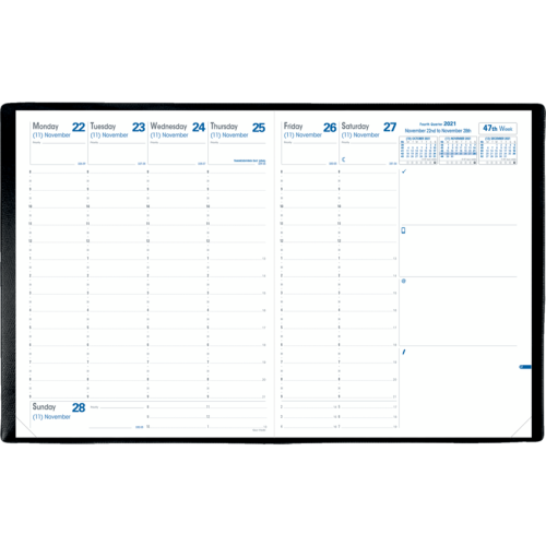 Sewn bound. 1 week per 2-page spread. 8:00 a.m. to 9:00 p.m. in 1/2 hour intervals. 10-3/4" x 8-1/4". English. Black.