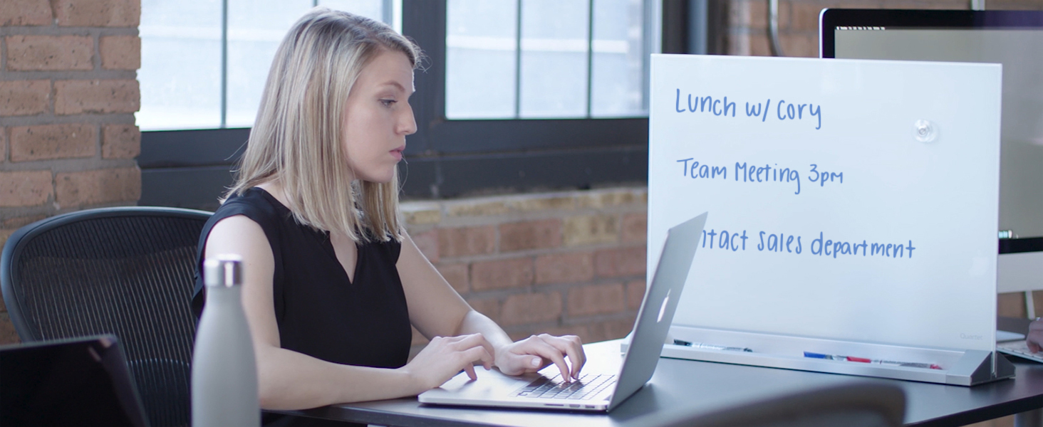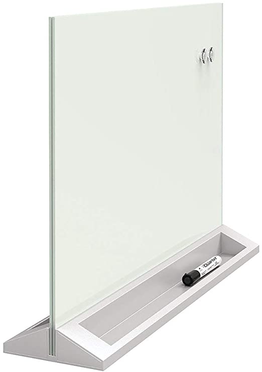 Self-standing, double-sided dry-erase surface keeps notes and ideas at your fingertips while providing personal workspace privacy Built-in accessory channel for markers and pens. Includes one Quartet® dry-erase marker and two Quartet® high power magnets. 17" x 23". 15-year limited warranty.