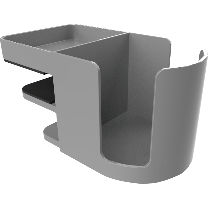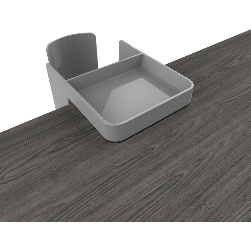 Conveniently holds your items steady and out of the way. Easily and securely clamps to side of desk, no tools needed. Adjusts to fit 3/4" to 2" flat rails. Protective cushioned pads are safe for desktop surfaces Cup Holder. Small tray provides quick access to clips or loose change. ABS. 4"W x 7"D x 3-1/2"H. Grey.