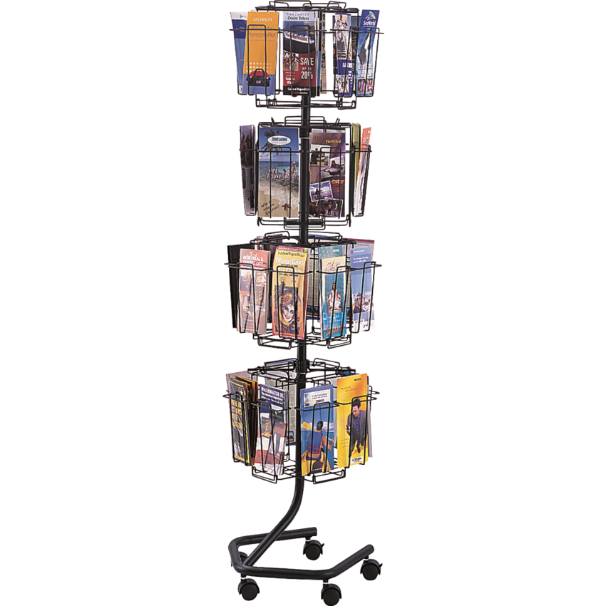 Full-view wire display. Each level rotates independently. Greenguard certified. Pamphlet size. Features 32 compartments, each measuring 4-1/2"W x 1"D. Includes 5 dual-wheel casters (2 locking). 15"W x 15"D x 60"H.