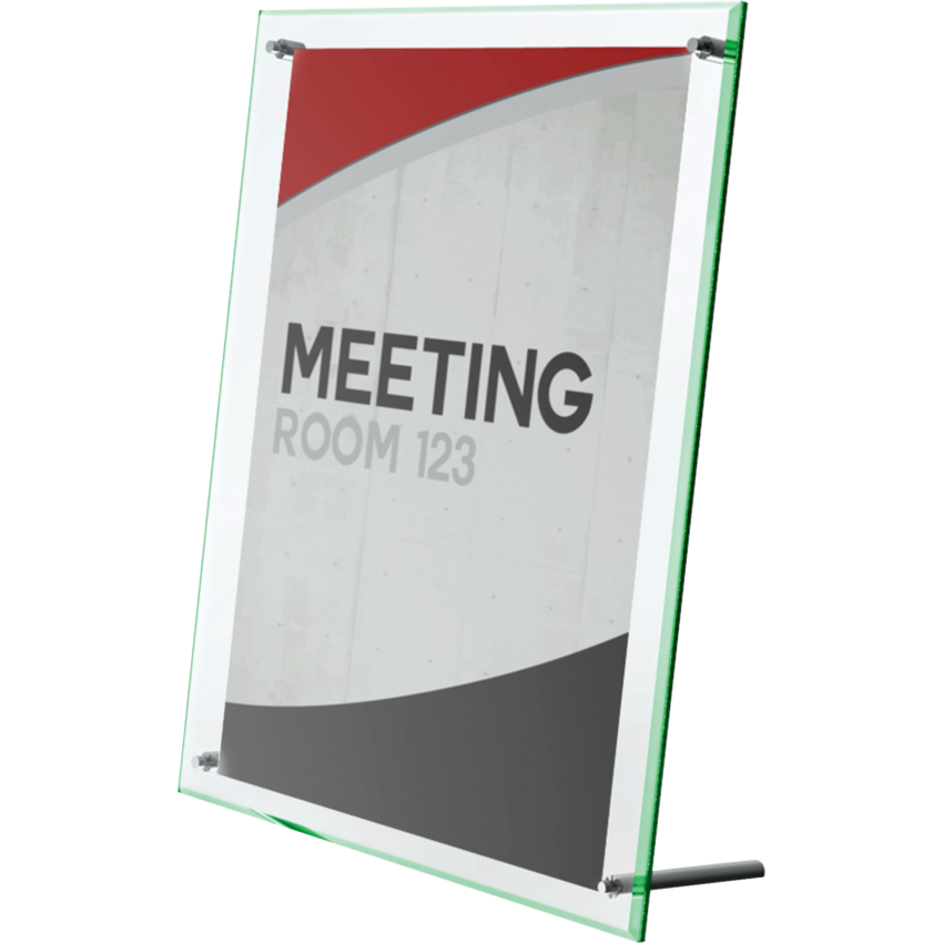 Green tinted edge looks like real glass. Plastic panels hold sign securely. Metal knobs unscrew to easily change literature and orientation (horizontal or vertical). Flat. 5" x 7".