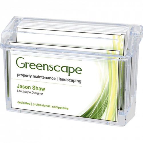 Durable, weather-resistant card holder goes anywhere. Adheres to glass or any smooth surface. Includes mounts with adhesive tape. 50-card capacity. 4-1/4"W x 1-1/2"D x 2-3/4"H. Clear.