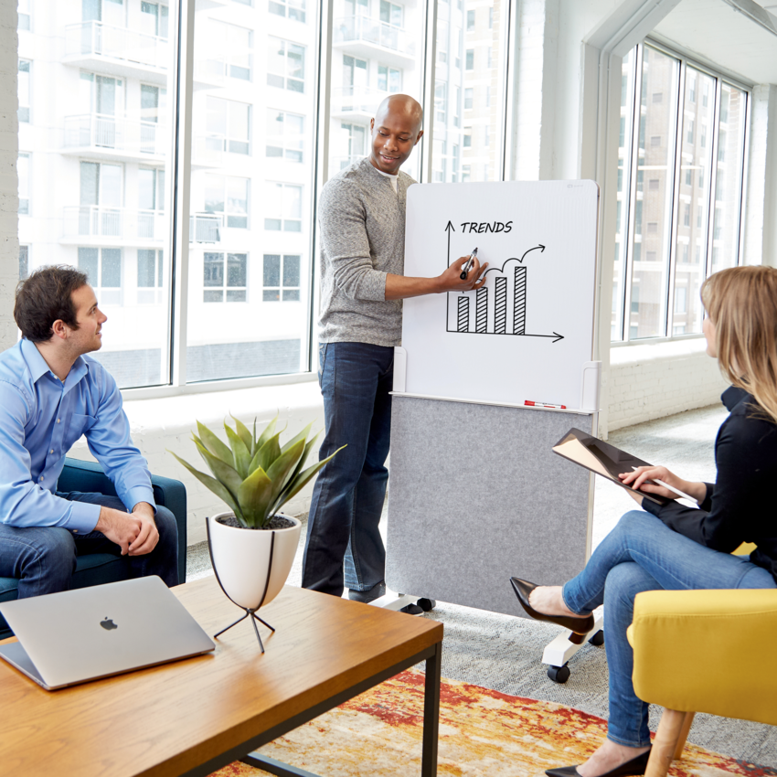 Easily raise or lower glass surface to provide usable writing surface or privacy. Easel nests and collapses for easy storage in corners, against walls, or in storage closets. Features easy grip handles and large casters. 27-1/2" x 60-9/10". Grey and White.