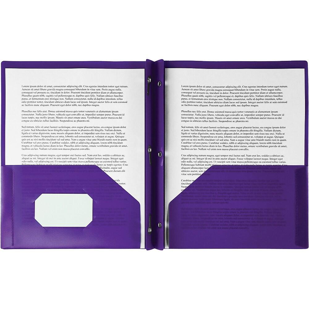 Two-pocket portfolio features a durable, polypropylene construction that resists tears and moisture to keep your important documents safely stored. Built-in prongs provide a convenient storage option for your three-hole punched papers. High-quality design works well with labels to let you create a customized appearance. Portfolio is perfect for office, home and school use. Portfolio is designed to hold up to 135 sheets of letter-size paper.