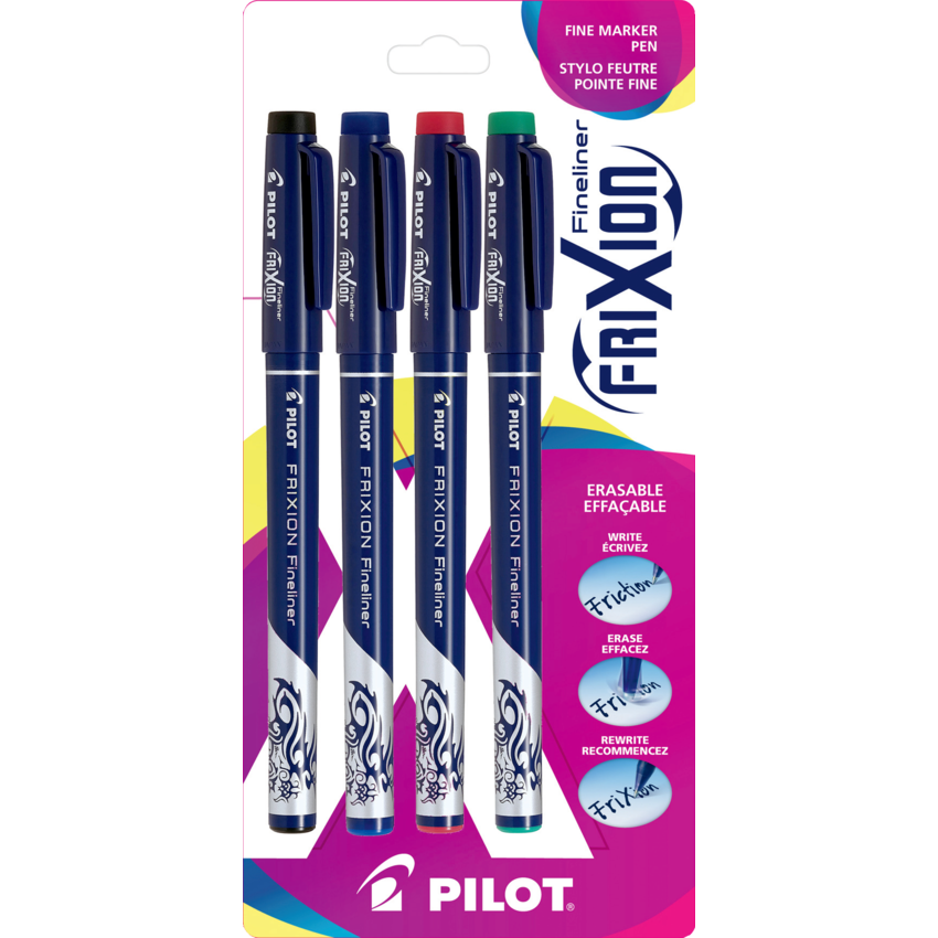 Unique marker pen which combines the popular Fineliner and the Frixion pen. Erasable water-based ink offers a smooth stroke that requires no writing pressure. Ideal for writing and drawing. The ink becomes invisible with erasing friction from the rubber tip on the cap Fine tip. Assorted Colours. 4/pkg.